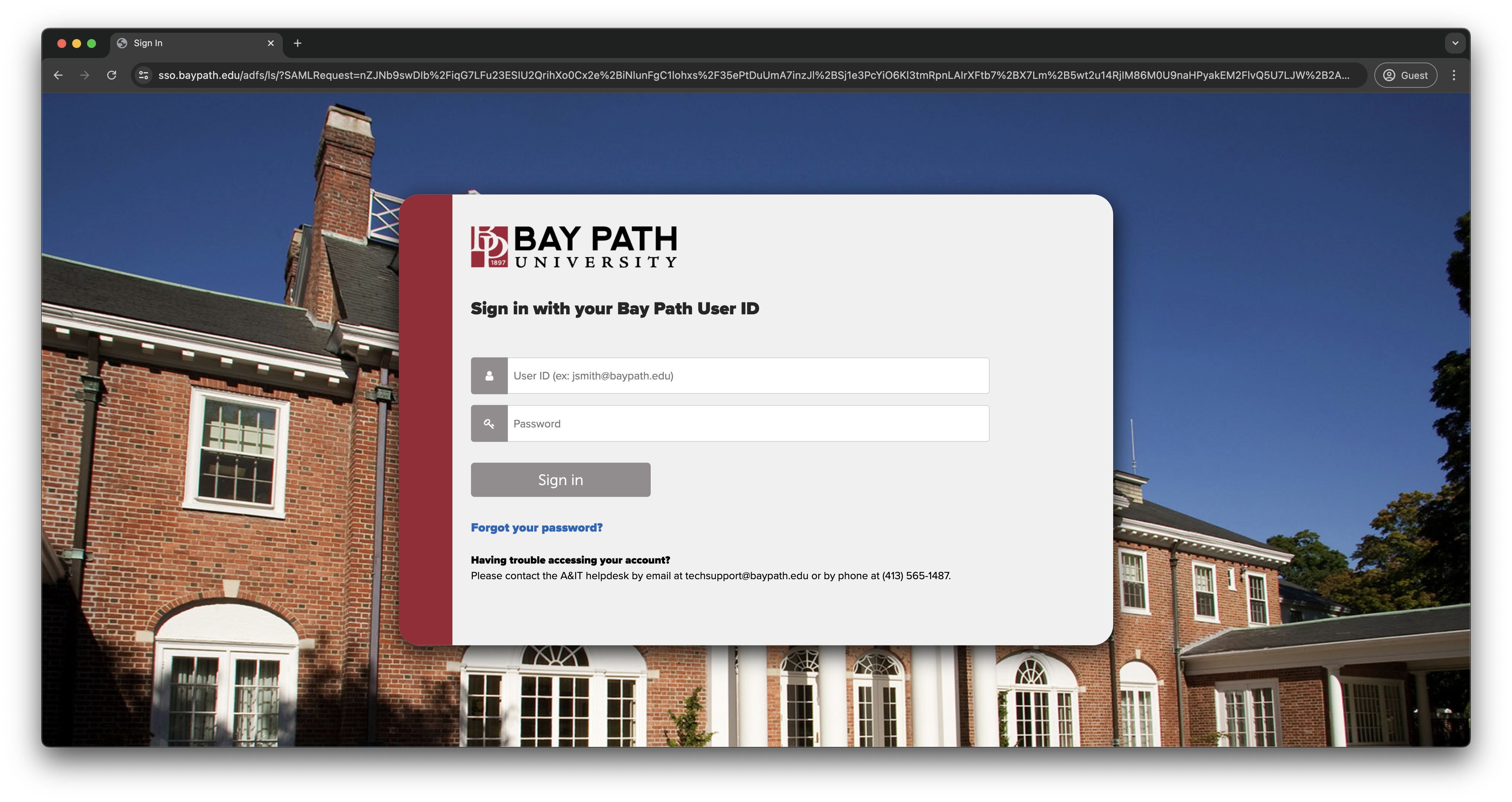 You will be redirected to the Bay Path SSO page. Sign in with your email and password.