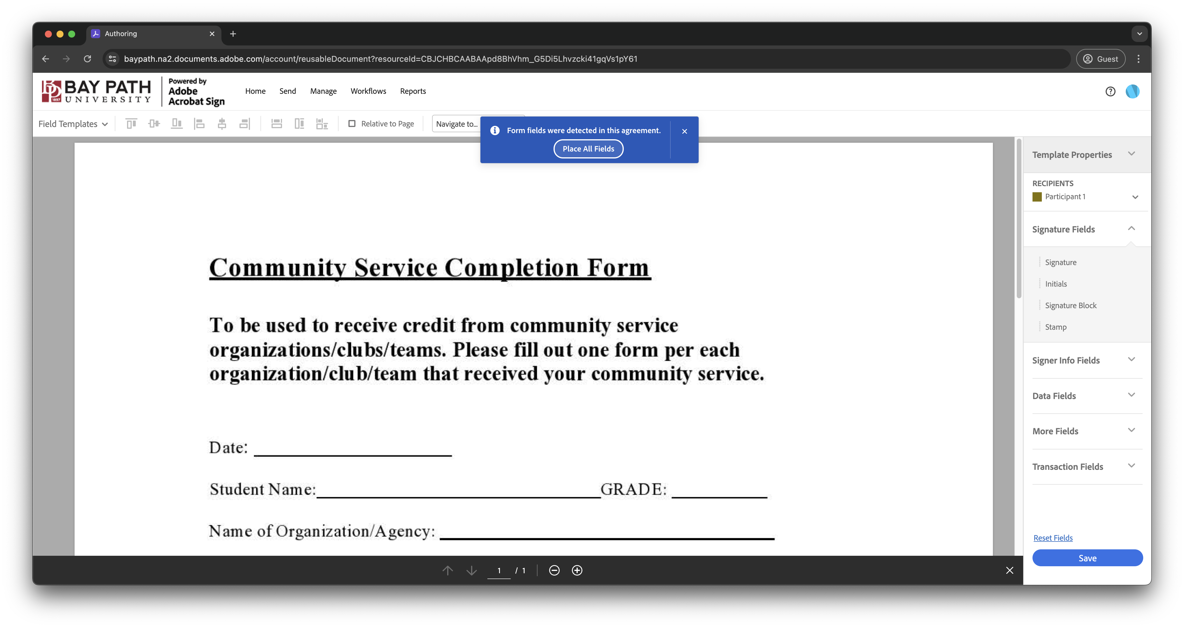 The document is now ready for adding fields. The form fields are automatically detected in the PDF. Click Place All Fields to place the detected form fields in the PDF document. Alternatively, drag fields from the tabs in the right pane and drop the fields where desired in the document.