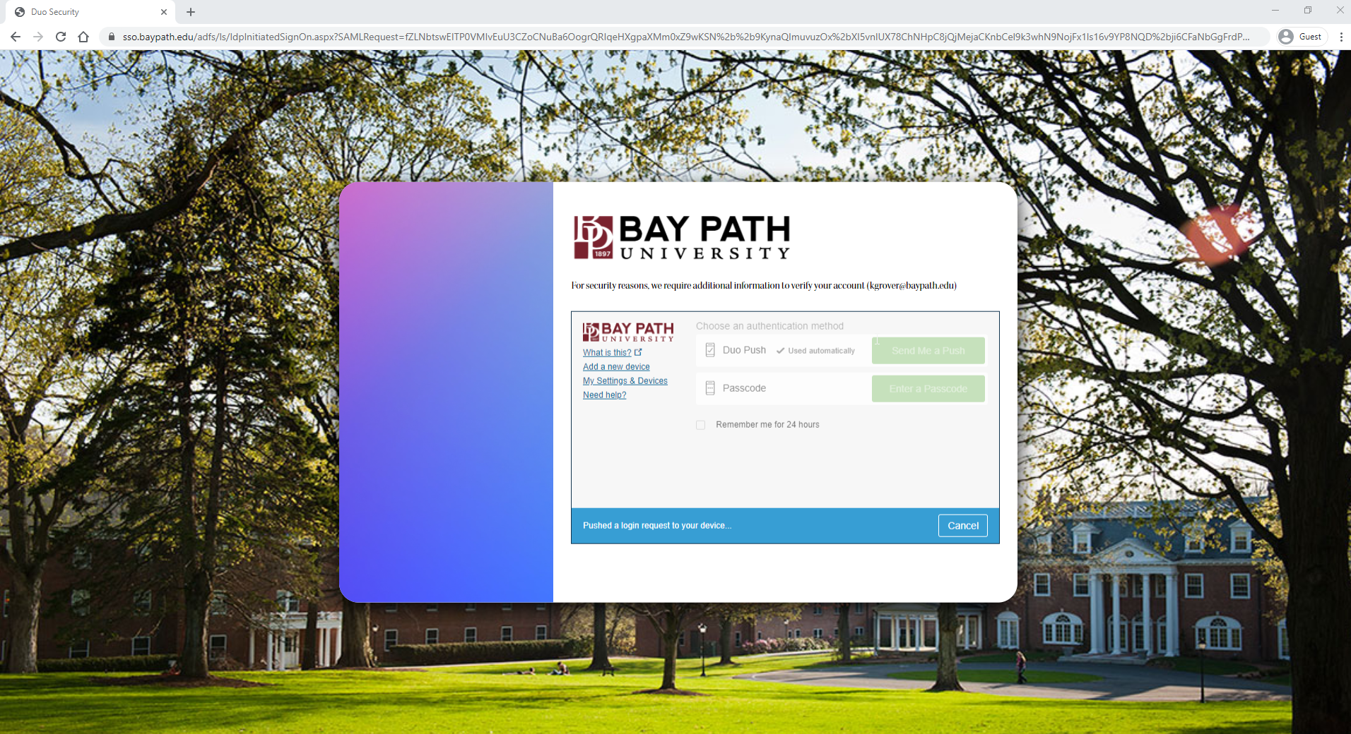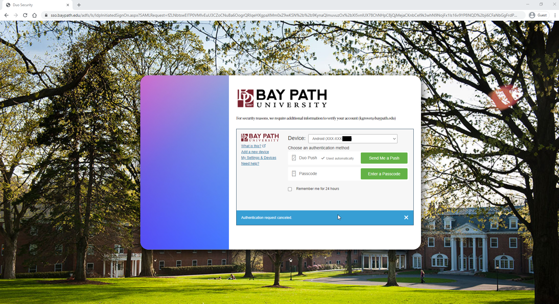 Visit a Duo-enabled service such as the My Bay Path Portal, or Canvas and sign in with your Bay Path email address and password. When you are prompted to sign in, press "Cancel." If you do not see this prompt, continue to the next step.