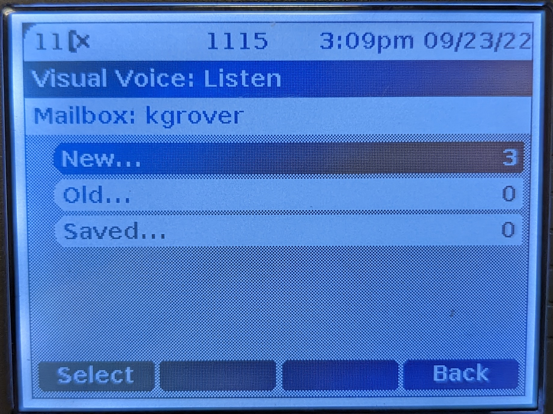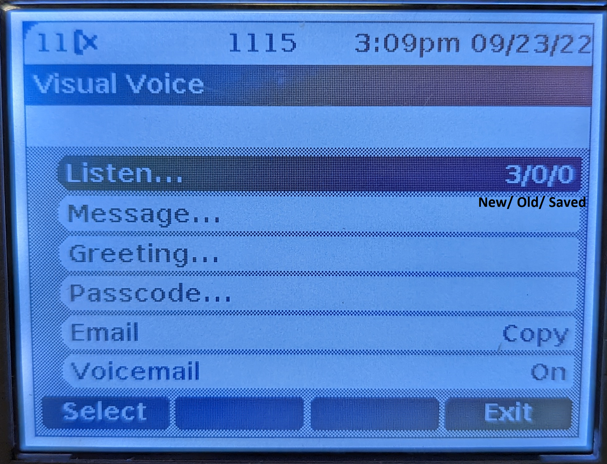 Use the up/down keys to highlight which messages (New, Old, or Saved) that you want to listen to and press Select.