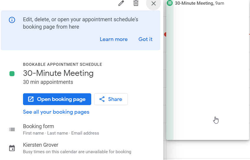 You can also open the booking page or share the link to your booking page so that people can start scheduling meetings with you