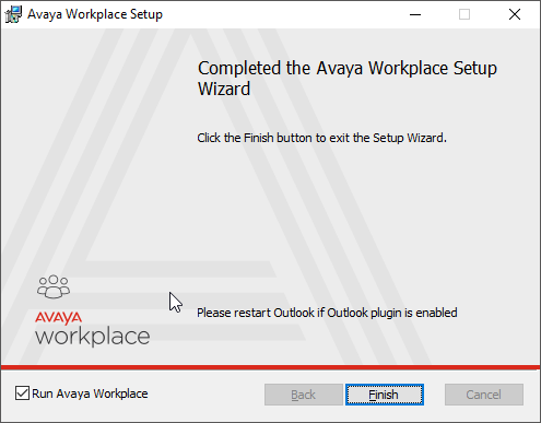 Select Finish after Avaya Workplace has been installed. Avaya Workplace will open automatically.